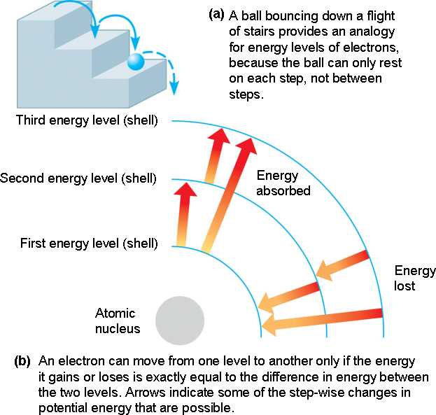 Electrons exist only at fixed levels of energy, which are also called electron shells.