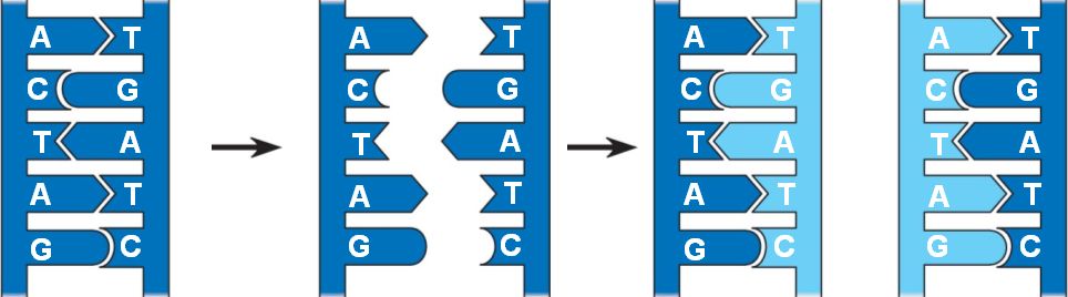 | The parent molecule is a double helix (untwisted for simplification). | The 2 strands are separated, breaking the hydrogen bonds between the bases. | 2 "daughter" DNA molecules are produced, each consisting of one parental strand and one new strand. | ||